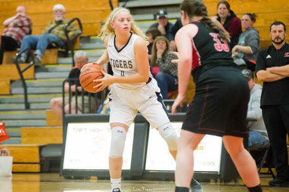 Hall led Taft with five points and freshman Kaden Hindman added a 3-pointer. Senior Tyee Fisher was whistled with a couple of quick fouls, causing some concern for the visiting team already battling the pair of dominant interior players of the Bulldogs. Taft was already challenged by the absence of Darrington, compounded by the illness of “Little Fish,” Trenton Fisher, who was barely getting back to full health following an extended leave during the month of December. The Tigers, finding themselves short a post and a point-guard, fought through the first eight minutes, committing few turnovers, and managing to hold the Bulldogs with man-to-man defense.